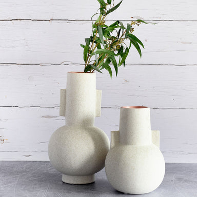 A classic gourd sillhouette with a beautifully glazed speckled finish in cream on the exterior and an unexpected peachy pink glazed interior. Its s...