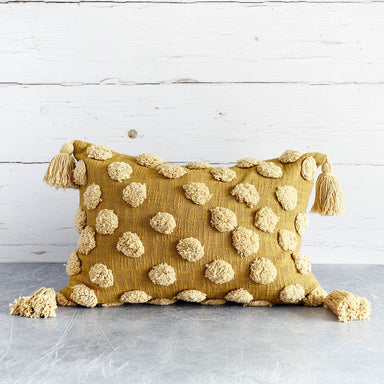 Beautifully handcrafted geometric tufted pillow featuring cute chunky tassels at the sides. Its texture, tone and playful details is the perfect co...