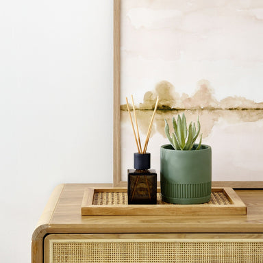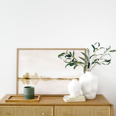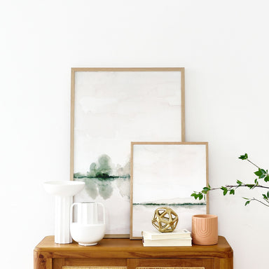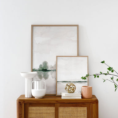 Give your sideboard instant dimension with abstract art prints, artisanal ceramics and brass elements. This set contains: Misty Lake By the Forest...